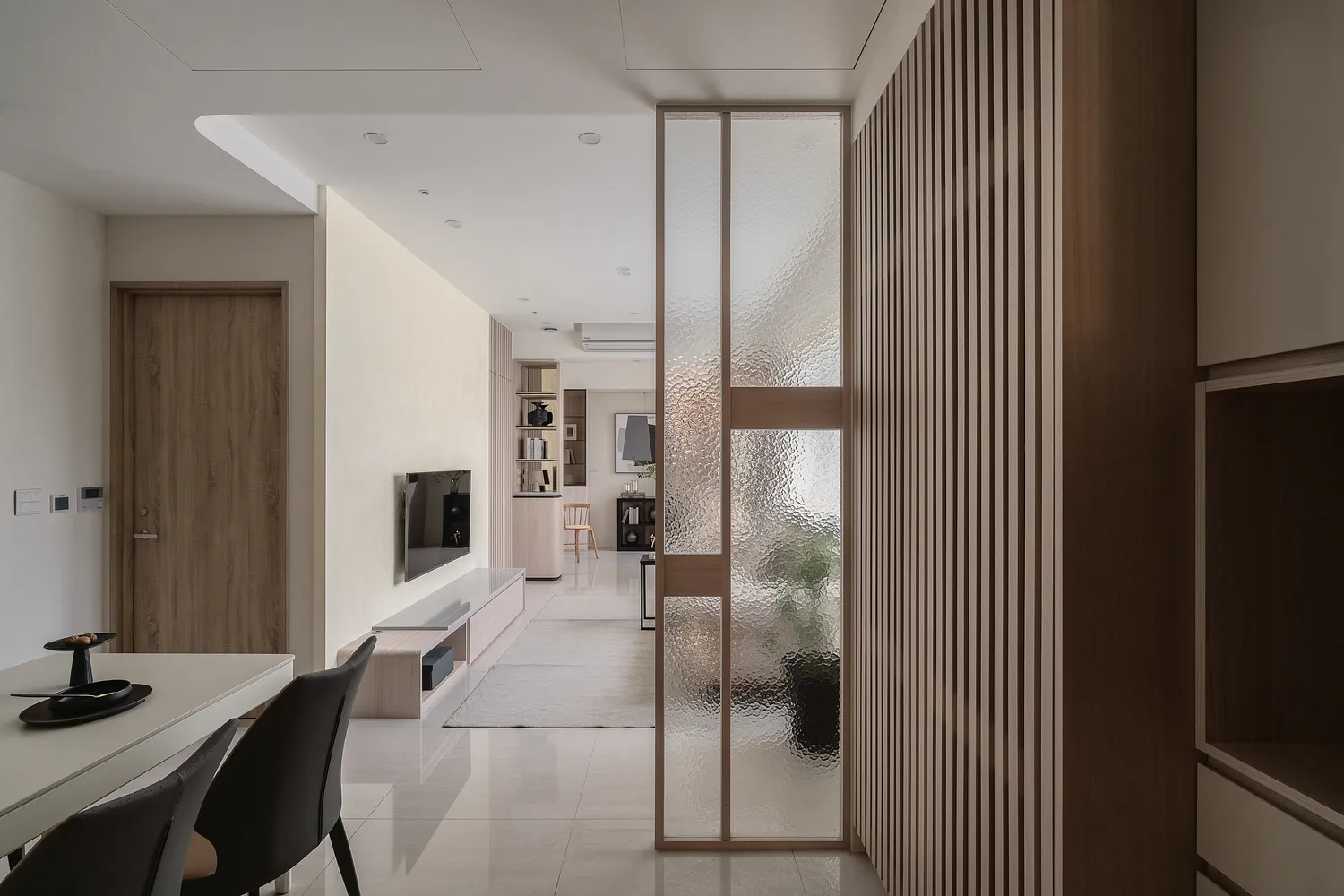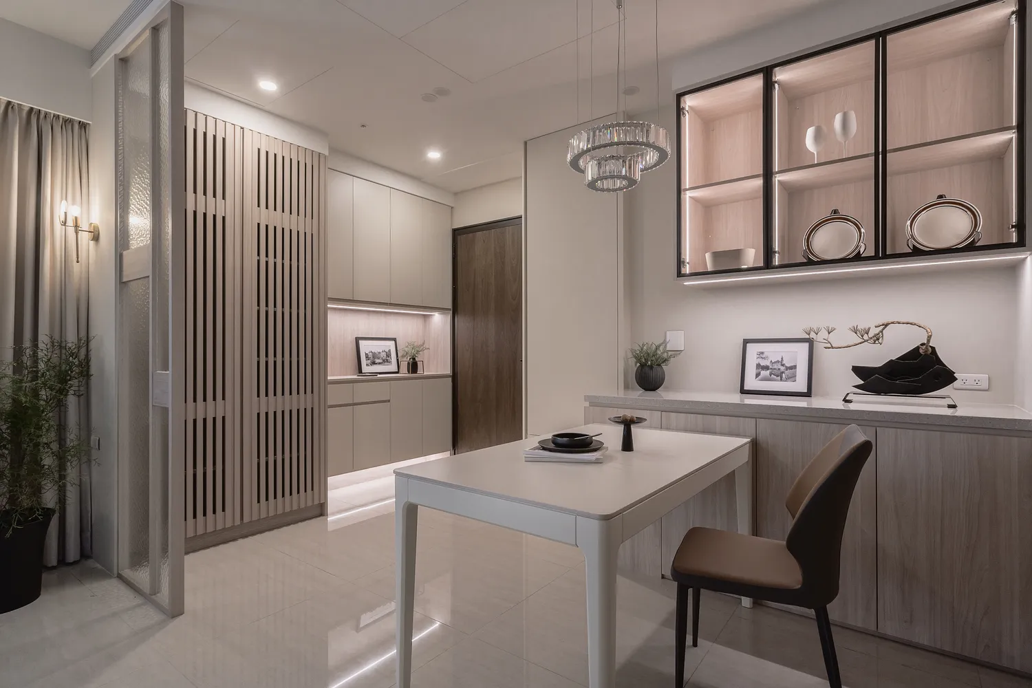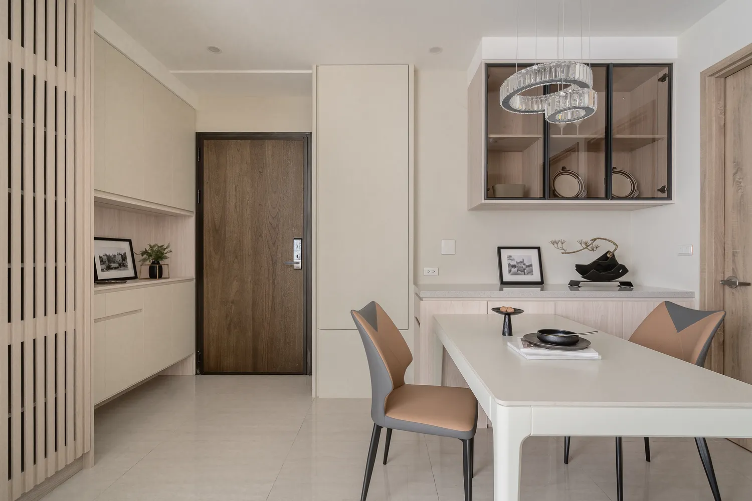 使用建材|天然木皮、義大利特殊塗料、灰鏡、水波紋玻璃、系統板材、鋁框門、LG人造石