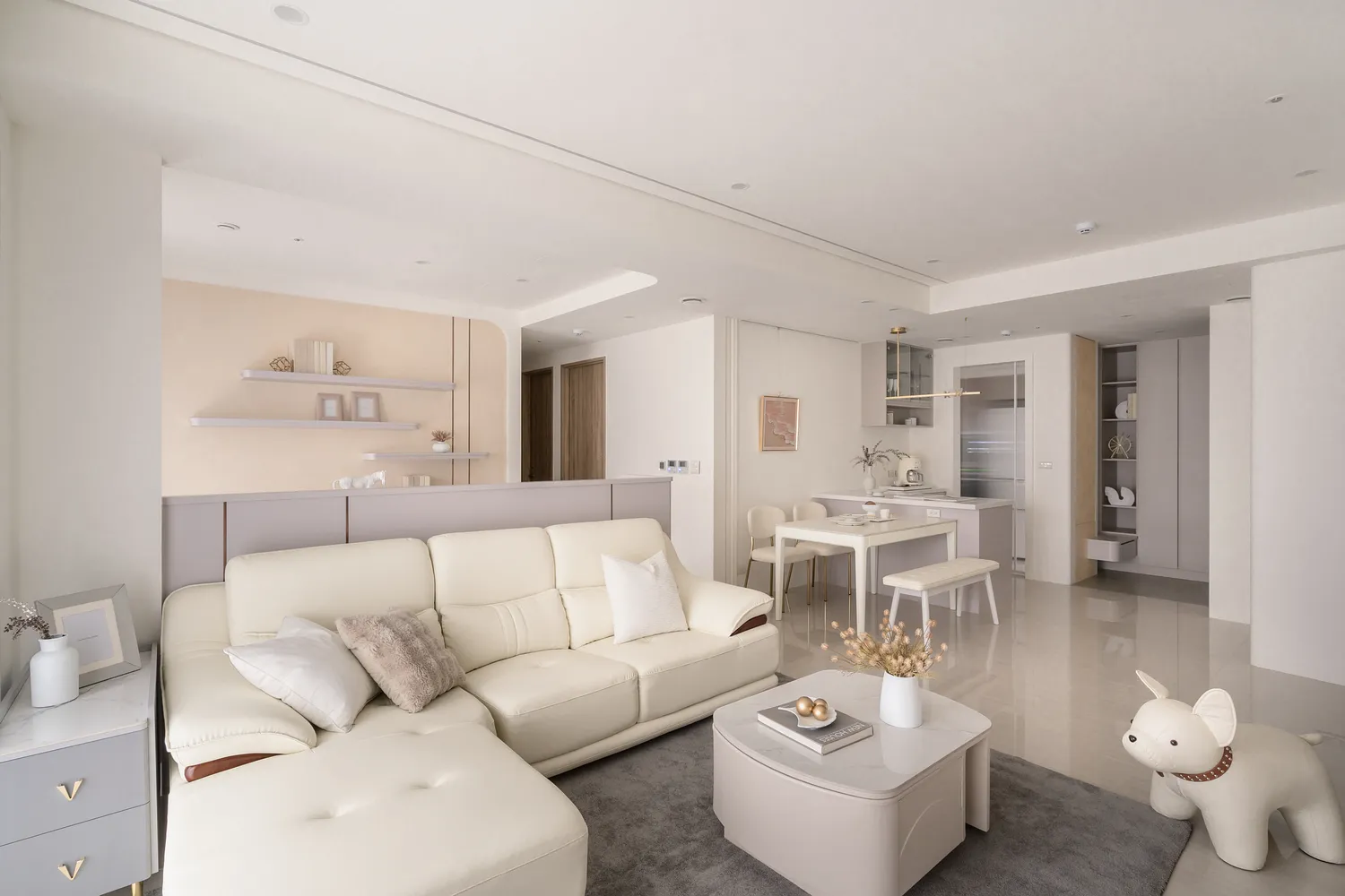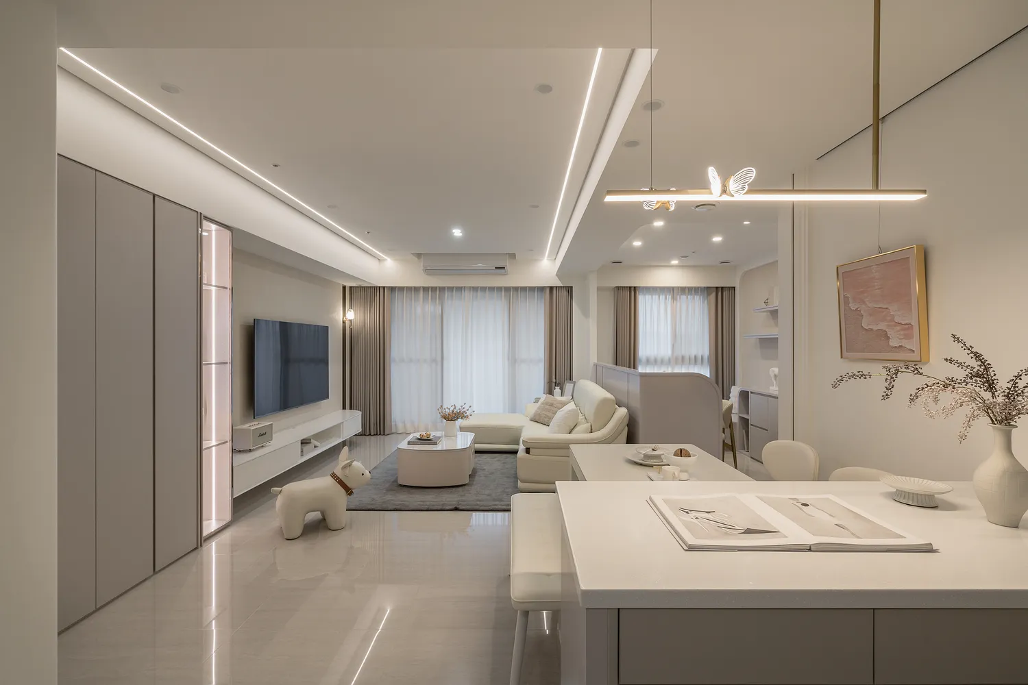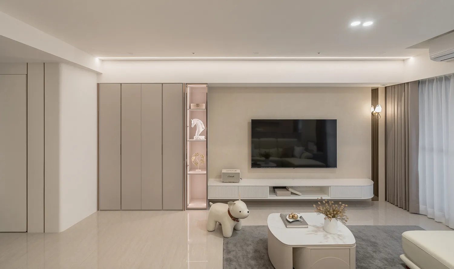 風格|現代輕奢 坪數|35坪 格局|3房2廳2衛 類型|新成屋 使用建材| 國產磁磚/鍍鈦鐵件/鍍鈦金屬條/烤漆/烤漆塗料/義大利特殊塗料/灰玻璃/灰鏡/長虹玻璃/LG人造石/系統板材